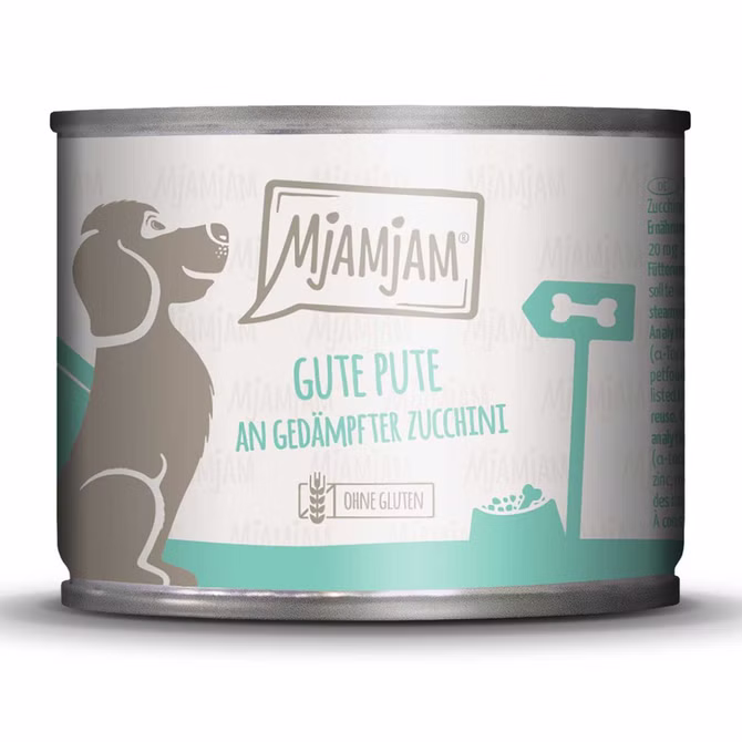 Mjamjam Gute Pute an gekochtem Reis mit gedämpfter Zucchini ist ein hochwertiges Hundefutter. Es enthält viel Fleisch und wird durch Reis und gedämpfte Zucchini verfeinert. Diese Rezeptur liefert alle benötigten Vitamine und Mineralien für Deinen Hund. Bei diesem Futter wird auf Gluten, Zucker und Konservierungsmittel verzichtet. Das Futter soll möglichst naturbelassen sein. Es enthält ausschließlich Fleisch aus einer tierischen Proteinquelle, ist also ein Monofutter.
