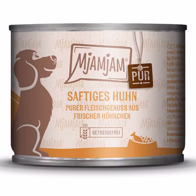 Mjamjam saftiges Huhn pur ist ein reiner Gaumengenuss für Hunde. Dieses leckere Hundefutter besteht zu 100% aus reinem Fleisch vom Huhn und enthält ausschließlich natürliche Inhaltsstoffe. Die Rezeptur ist getreidefrei und selbstverständlich ohne Zuckerzusatz.