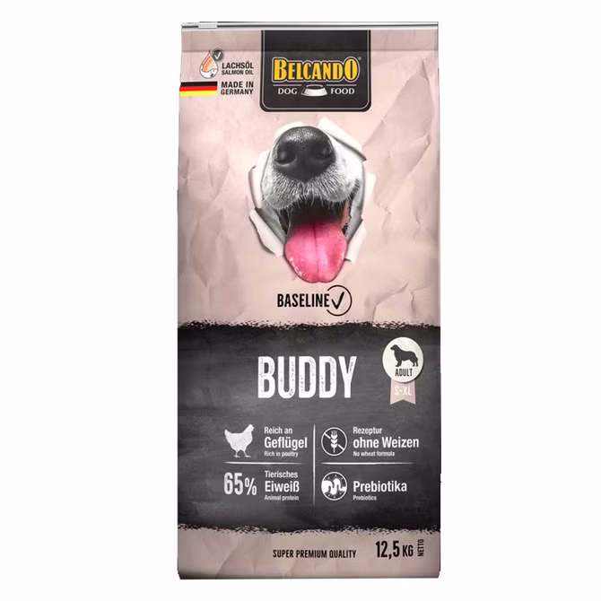 Belcando Buddy ist ein ausgewogenes weizenfreies Trockenfutter für erwachsene Hunde. Das Futter ist reich an Geflügel und wurde mit wertvollem Lachsöl für Omega3 und Omega6-Fettsäuren verfeinert. 65% tierisches Eiweiß und 23% Protein sowie 11% Fettgehalt zeichnen dieses Futter aus.