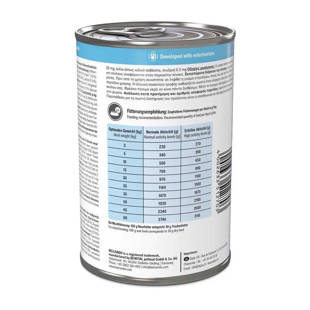Durchschnittswerte für die Fütterung von Hunden sind in der separaten Tabelle aufgeführt. Empfohlene Fütterungsdauer: Zunächst bis zu 6 Monate. Es wird empfohlen, vor der Verwendung oder vor Verlängerung der Fütterungsdauer den Rat eines Tierarztes einzuholen. Die richtige Fütterungsmenge lässt sich am besten über eine regelmäßige Gewichtskontrolle des Hundes ermitteln. Frisches Trinkwasser sollte immer zur freien Verfügung stehen. Nach dem Öffnen max. 24 Stunden im Kühlschrank aufbewahren.
