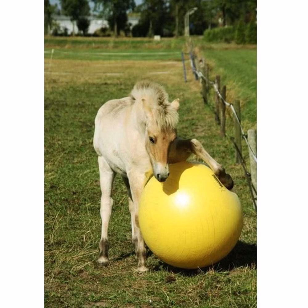 Die gelbe Farbe macht den Ball für Pferde besonders gut sichtbar.