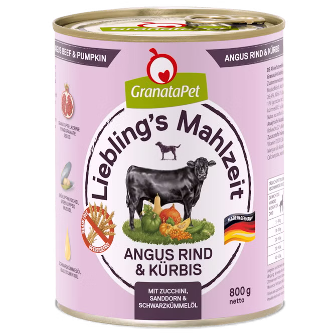GranataPet Lieblings Mahlzeit Angus Rind Kürbis überzeugt mit viel Fleisch aus einer Proteinquelle (monoprotein) und stellt eine artgerechte und schmackhafte Mahlzeit jeden Hund dar.