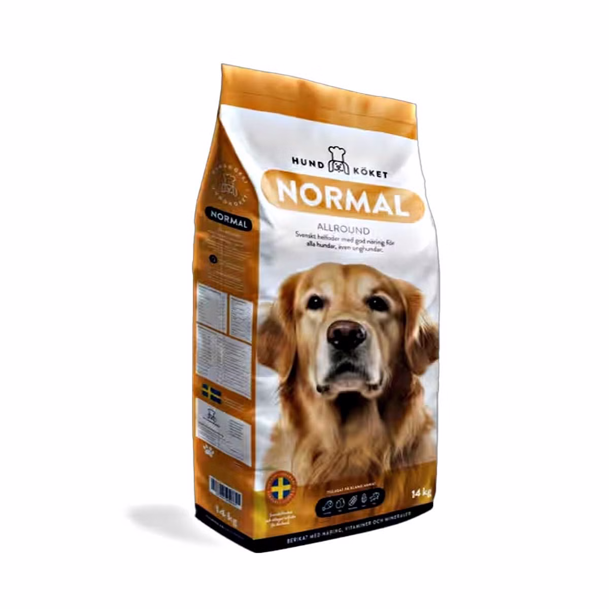 Hundeköket Normal ist ein Trockenfutter für erwachsene Hunde und Junghunde großer Rassen (Labrador, Leonberger, Berner Sennenhund usw) ab dem 7. Lebensmonat. Es ist ein ausgewogenes Alleinfuttermittel für Hunde mit normalem Temperament und durchschnittlichem Energiebedarf. Die Rezeptur eignet sich für Hunde aller Rassen und Altersstufen und unterstützt eine bedarfsgerechte, alltagstaugliche Ernährung.