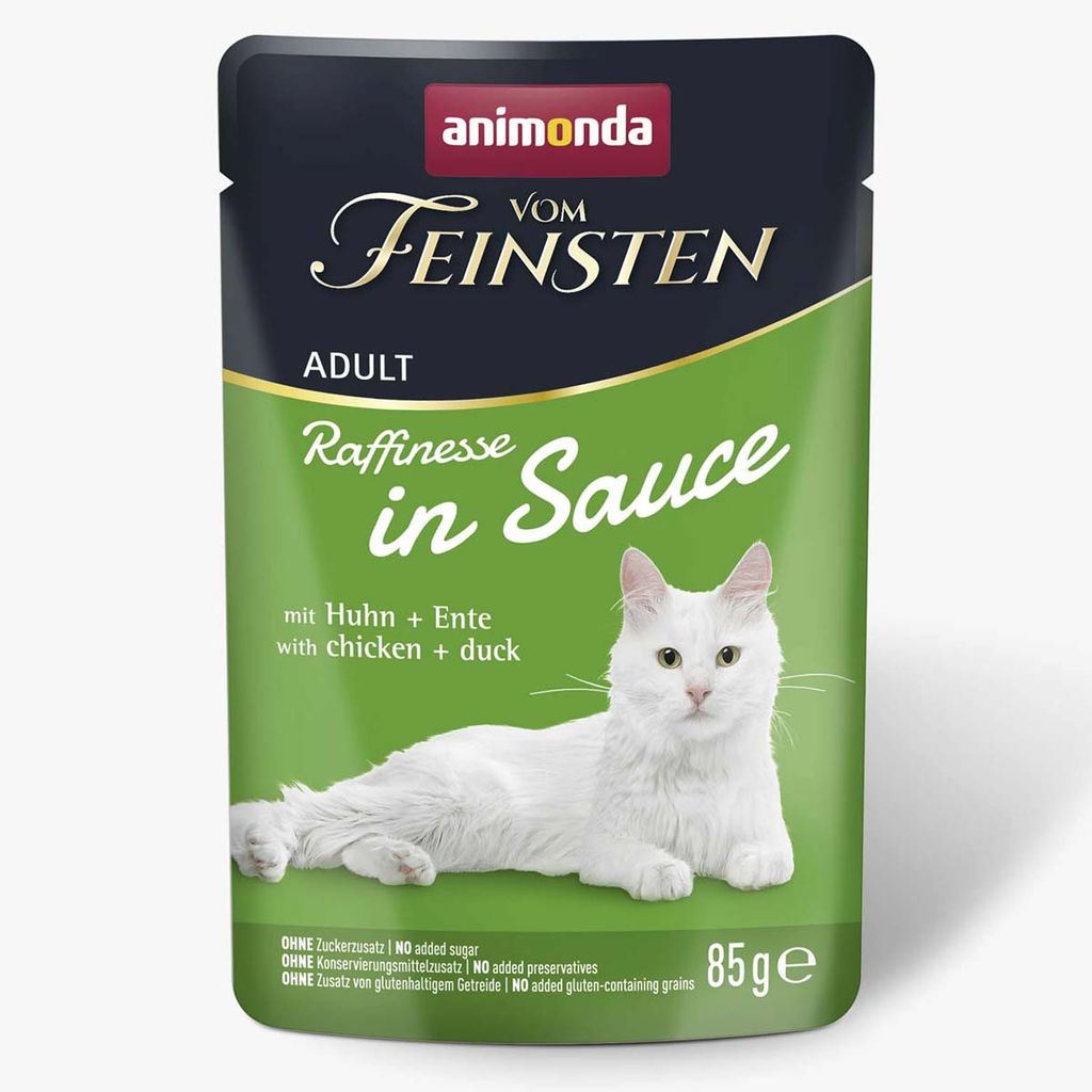 Animonda Vom Feinsten Adult Raffinesse in Sauce mit Huhn und Ente ist die perfekte Wahl für anspruchsvolle Katzen, die nur das Beste verdienen. Saftige Fleischstückchen in köstlicher Sauce sorgen für Genuss und liefern alles, was deine Katze täglich braucht.