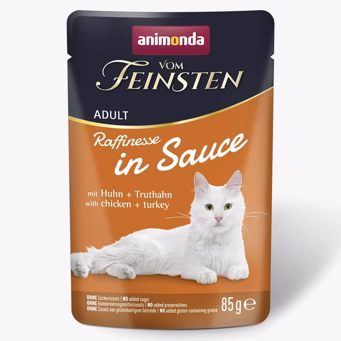 Animonda Vom Feinsten Adult Raffinesse in Sauce mit Huhn und Truthahn ist die perfekte Wahl für anspruchsvolle Katzen, die nur das Beste verdienen. Saftige Fleischstückchen in köstlicher Sauce sorgen für Genuss und liefern alles, was deine Katze täglich braucht.