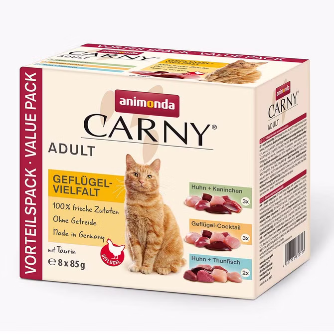Carny Adult steht für ausgewogene, leckere gesunde Ernährung auf höchstem Niveau für ausgewachsene Katzen von 1-6 Jahren. Die ausgewählten, frischen fleischlichen Rohstoffe garantieren den unvergleichlichen Geschmack, den Katzen überaus schätzen. Carny Adult Animonda Carny Geflügelvielfalt in Pouchbeuteln stehen für ausgewogene, leckere gesunde Ernährung auf höchstem Niveau für ausgewachsene Katzen. Die ausgewählten, frischen Rohstoffe, hauptsächlich vom Geflügel, garantieren den unvergleichlichen Geschmack, den Katzen überaus schätzen. Carny Adult versorgt die ausgewachsene Katze mit allen lebenswichtigen Nährstoffen.