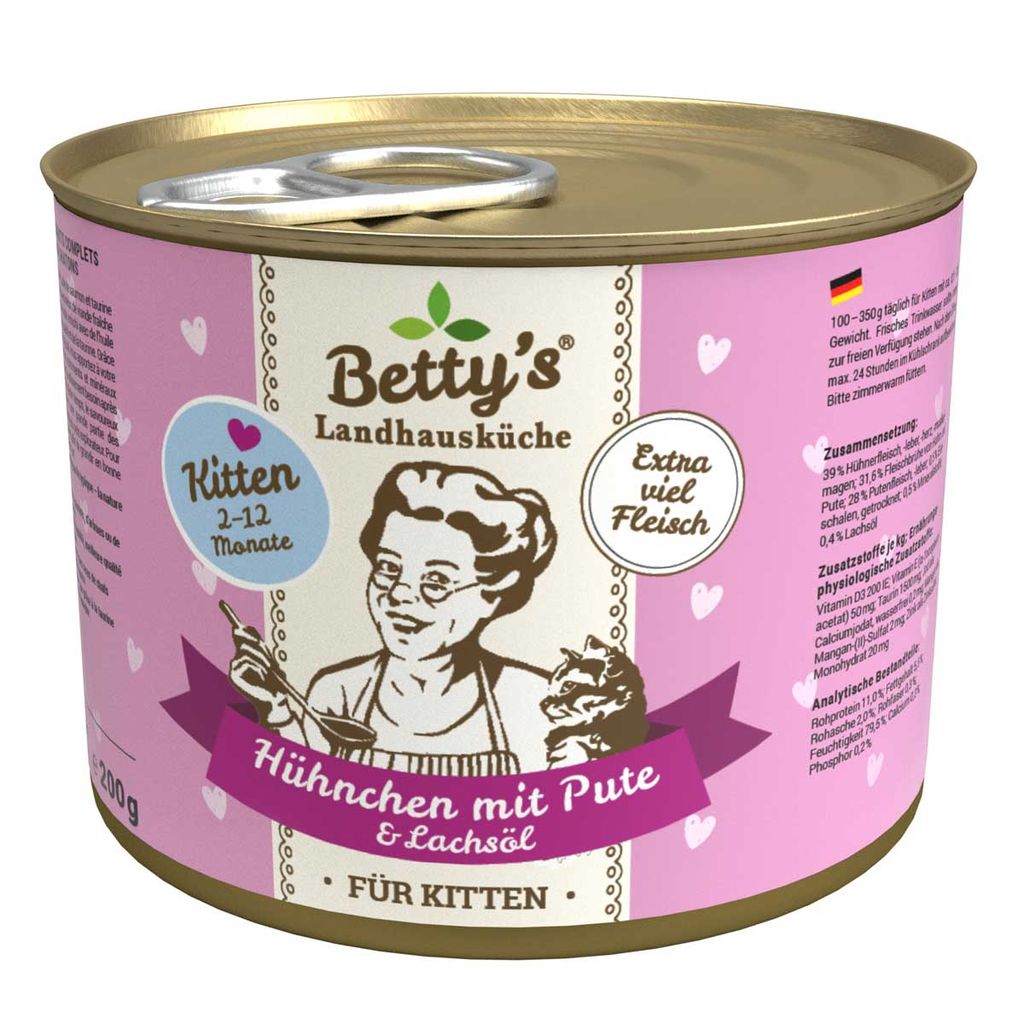 Bettys Landhausküche Kitten ist ein Alleinfuttermittel für alle heranwachsenden Kitten im ersten Lebensjahr zur optimalen Unterstützung der Entwicklung und des Wachstums.
