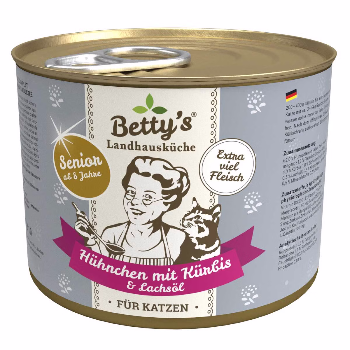 Bettys Landhausküche Senior Hühnchen ist ein speziell auf die Bedürfnisse älterer Katzen ab ca. 8 Jahren abgestimmtes Nassfutter. Die Rezeptur ist getreidefrei und enthält alle wichtigen Nährstoffe, die eine ältere Katze benötigt. Das enthaltene hochwertige Hühnerfleisch liefert notwendige Proteine, der köstliche Kürbis ist reich an Ballaststoffen und Vitaminen und das enthaltene Lachsöl enthält wertvolle Omega-3-Fettsäuren.