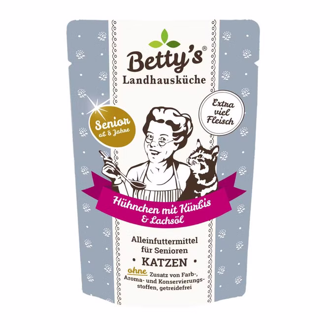 Bettys Landhausküche Senior Hühnchen ist ein speziell auf die Bedürfnisse älterer Katzen ab ca. 8 Jahren abgestimmtes Nassfutter. Die Rezeptur ist getreidefrei und enthält alle wichtigen Nährstoffe, die eine ältere Katze benötigt. Das enthaltene hochwertige Hühnerfleisch liefert notwendige Proteine, der köstliche Kürbis ist reich an Ballaststoffen und Vitaminen und das enthaltene Lachsöl enthält wertvolle Omega-3-Fettsäuren.