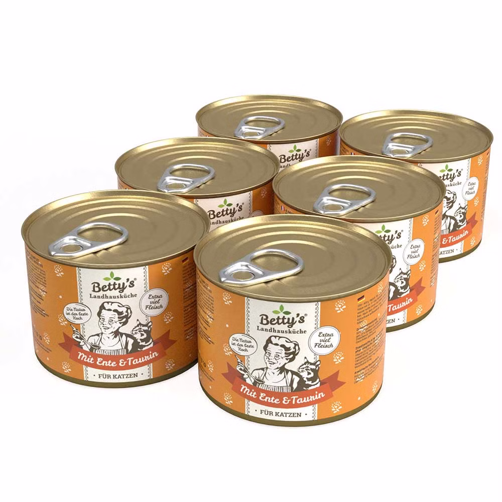 Bettys Landhausküche Ente ist ein Katzenfutter bester Qualität und mit delikatem Geschmack. Das in Bettys Landhausküche Ente enthaltene hochwertige Enten- und Geflügelfleisch enthält für Katzen wichtige Vitamine und Mineralstoffe. Es wird aus hochwertigem Fleisch hergestellt und schonend in Fleischbrühe gegart. Es ist für alle Katzenrassen geeignet. Der enthaltene Fleischanteil liegt bei 65 %, hinzukommen lediglich Fleischbrühe, Taurin und wichtige Mineralstoffe. Es werden ausschließlich Rohstoffe in Lebensmittelqualität und keine Abfallprodukte verwendet.