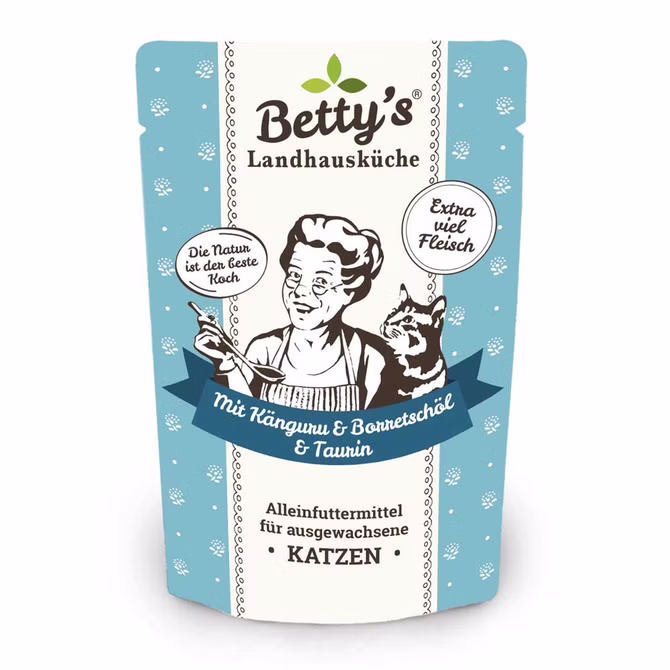 Bettys Landhausküche mit Känguru und Borretschöl im Frischepack eignet sich besonders für magensensible Katzen, aber natürlich auch für alle ausgewachsenen normal aktiven Schnurrer.