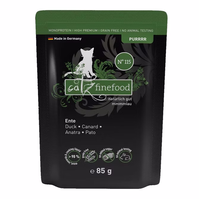 Überzeugen Sie sich und Ihre Katzen von diesem Superpremiumfutter aus deutscher Herstellung.catz finefood Purrrr Nr.115 Ente verwöhnt Ihre Katze und unterstützt das Wohlbefinden Ihres Lieblings.