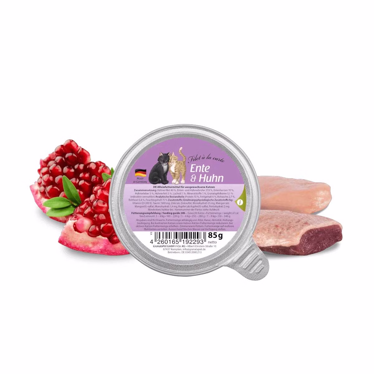GranataPet Filet à la carte mit Ente Huhn ist ein schmackhaftes Vollwertmenü aus zarten Filetstückchen. Verfeinert wird die Rezeptur durch hochwertiges Lachsöl und Granatapfelkerne. Schonend in der eigenen Brühe gegart ist das erstklassige naturbelassene Nassfutter besonders schmackhaft und bekömmlich. Das Lachsöl schützt die Haut Ihrer Katze und sorgt für ein seidiges, glänzendes Fell. Hinzu kommen Mineralstoffe, Taurin und weitere vitalisierende Zutaten, die das saftige Menü zu einer ausgewogenen Vollwert-Kost machen.