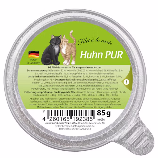 GranataPet Filet à la carte mit Huhn PUR ist ein schmackhaftes Vollwertmenü aus zarten Filetstückchen. Verfeinert wird die Rezeptur durch hochwertiges Lachsöl und Granatapfelkerne. Schonend in der eigenen Brühe gegart ist das erstklassige naturbelassene Nassfutter besonders schmackhaft und bekömmlich. Das Lachsöl schützt die Haut Ihrer Katze und sorgt für ein seidiges, glänzendes Fell. Hinzu kommen Mineralstoffe, Taurin und weitere vitalisierende Zutaten, die das saftige Menü zu einer ausgewogenen Vollwert-Kost machen.