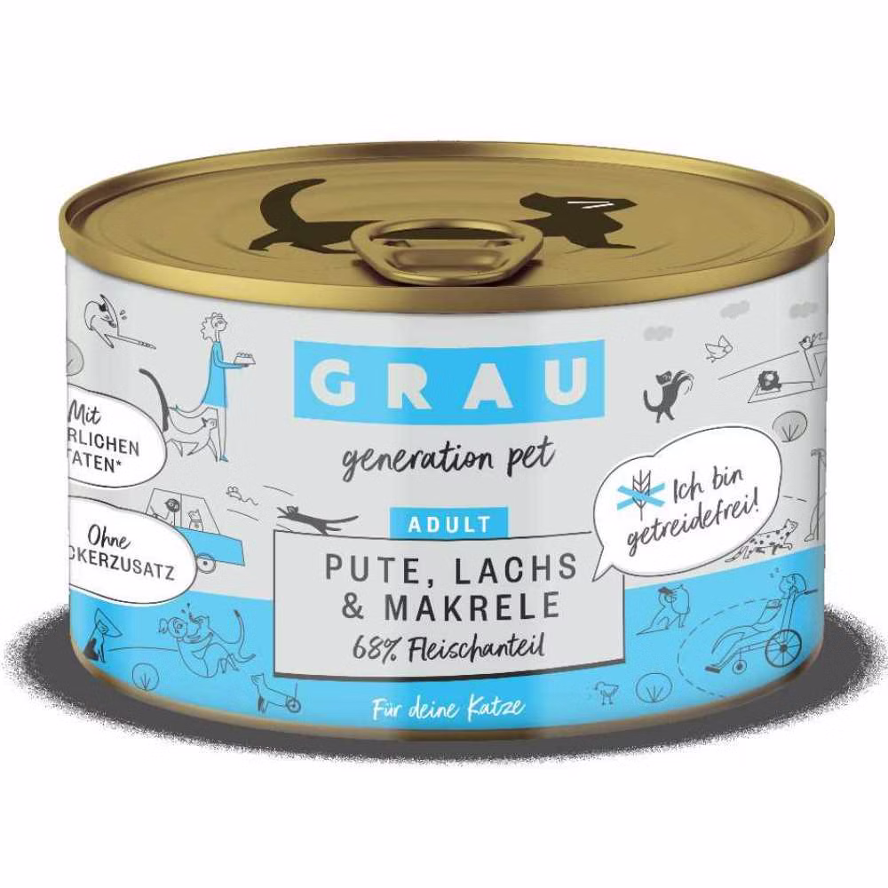 Grau Pute Lachs Makrele ist ein Nassfutter für erwachsene Katzen. Es besteht aus einer ausgewogenen Mischung an schmackhaftem Putenfleisch sowie Lachs und Makrele. Das Produkt ist reichhaltig an Omega 3 Fettsäuren und Proteinen. Es kann einen positiven Effekt auf Haut und Fell deiner Katze haben und ist leichtverdaulich