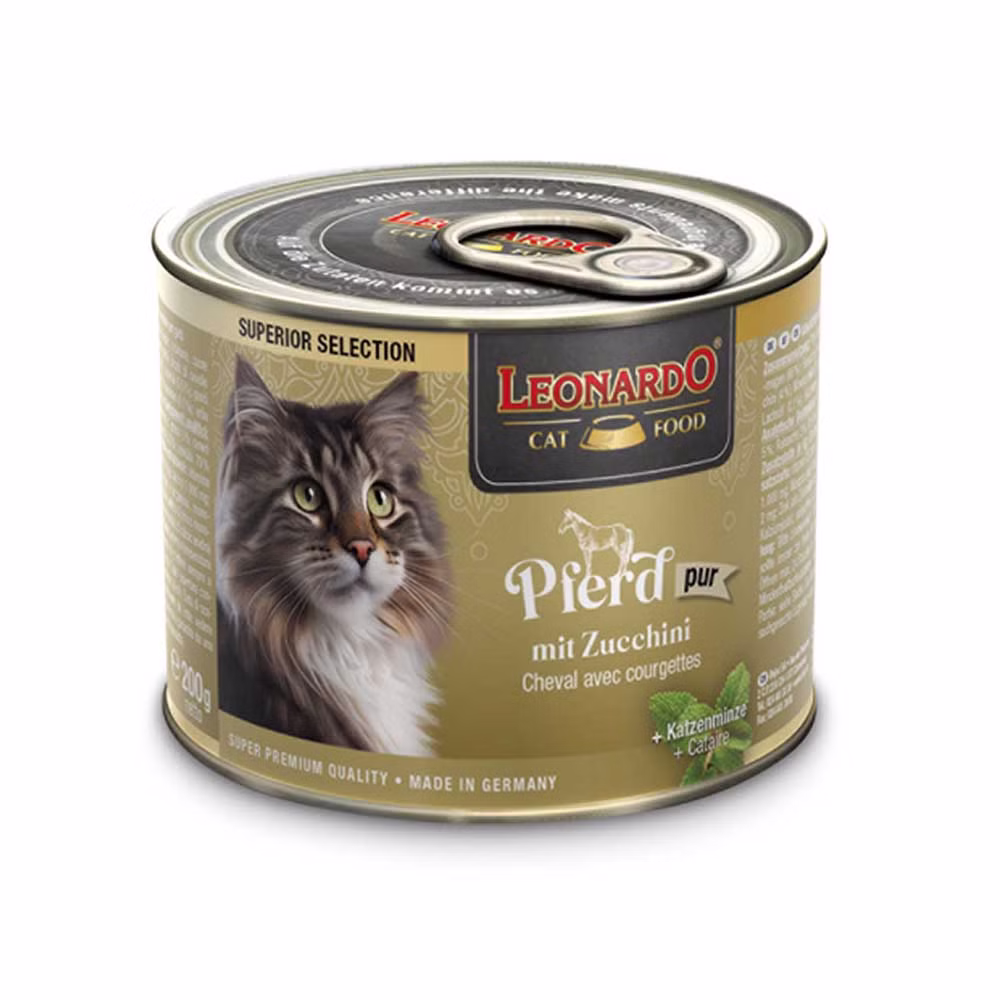 Leonardo Pferd pur ist ein Monoprotein Nassfutter für Katzen, die gerne mal eine besonderen Gaumenschmaus bevorzugen. Das Futter eignet sich auch bestens für allergiebehaftete Katzen, da reines Pferdefleisch als Proteinquelle hypoallergen ist. Das Futter wird durch feines Lachsöl abgerundet. Selbstverständlich ist es zuckerfrei und wird in Deutschland hergestellt.
