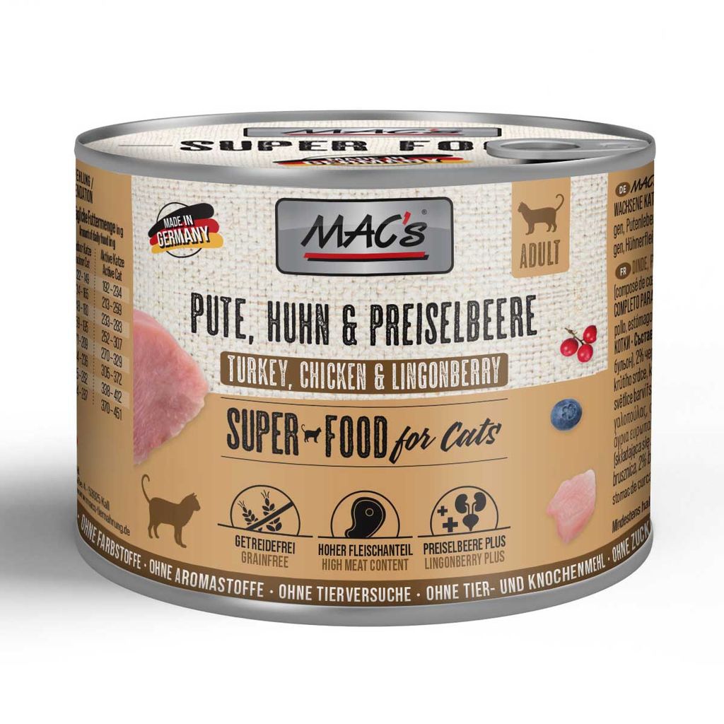 Macs Pute Huhn Preisebeere verwöhnt Deine Katze mit viel frischem Fleisch und getreidefreier Rezeptur. Daneben enthält das Futter wertvolle Vitamine und Distelöl, das Haut und Fell auf natürliche Weise unterstützen kann. Selbstverständlich enthält es Taurin in ausreichender Menge.