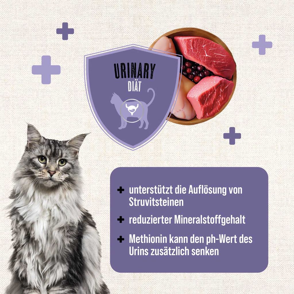 MACs Cat Vetcare Urinary Frisches Rind Pute wurde entwickelt, um bei der Auflösung von Struvitsteinen zu unterstützen. Durch den reduzierten Mineralstoffgehalt dieser Harndiät kann die Mineralstoffkonzentration im Urin verringert werden. Die Zugabe von Methionin kann den ph-Wert des Urins zusätzlich senken und ihn saurer machen, um die Bildung von Struvitsteinen zu reduzieren. Die Kombination aus frischem Rind und Pute zusammen mit Apfel sorgt für ein geschmackvolles Menü, das deiner Samtpfote unterstützt. Es wird empfohlen, vor der Verwendung oder vor Verlängerung der Fütterungsdauer den Rat eines Tierarztes einzuholen. Nicht geeignet für tragende sowie säugende Katzen und Kitten.