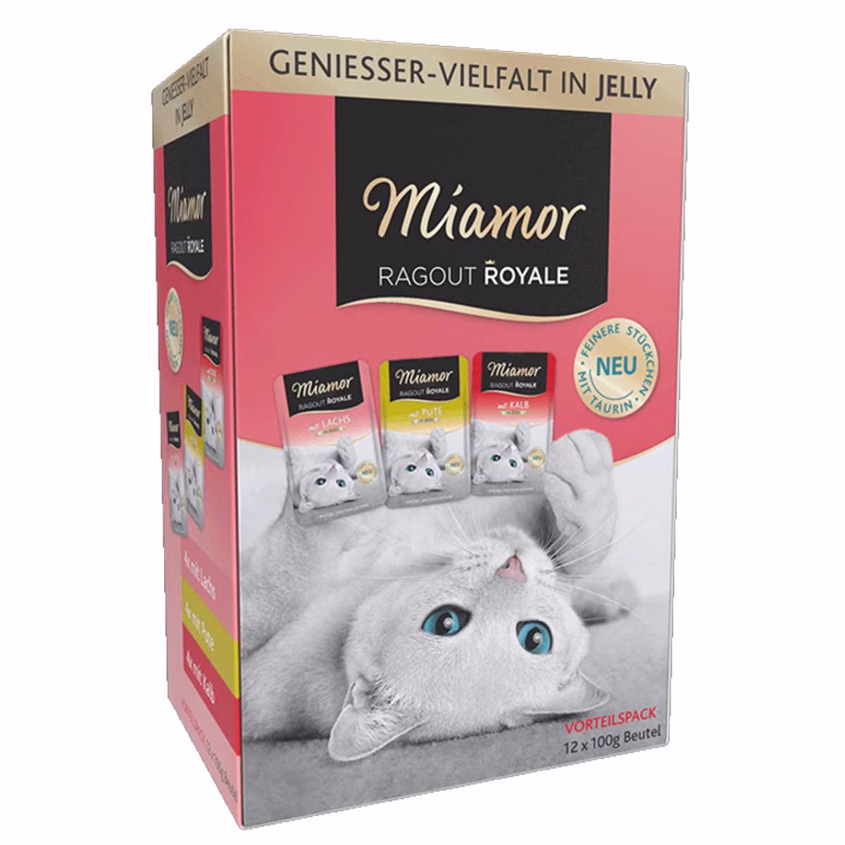 Miamor Ragout Royale in Jelly Multibox enthält zarte Ragout-Stückchen aus leckerem Fleisch und Fisch in delikater Jelly zubereitet. In dieser Multibox sind 3 verschiedene Sorten enthalten, so bekommt Ihr Liebling Abwechslung auf den Teller: Pute, Lachs sowie Kalb