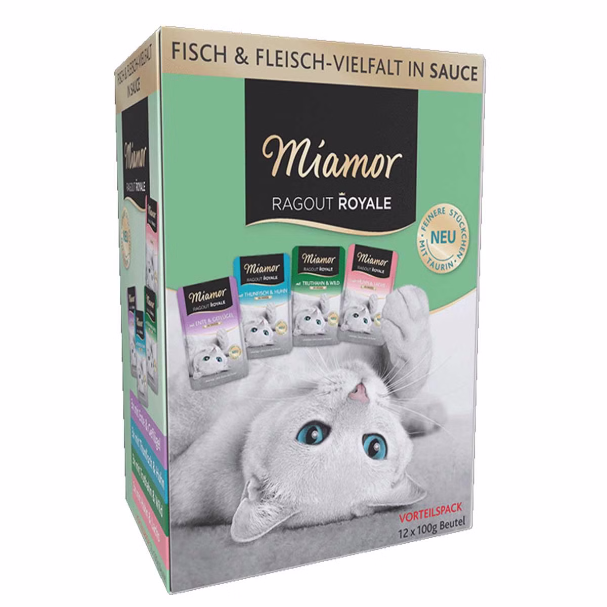 Miamor Ragout Royale in Sauce Multibox enhält zarte Ragout-Stückchen in leckerer Sauce zubereitet. In dieser Multibox sind 4 verschiedene Sorten enthalten, so bekommt Ihr Liebling Abwechslung auf den Teller: Huhn & Lachs, Thunfisch & Huhn, Ente & Geflügel sowie Truthahn & Wild