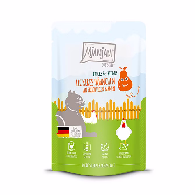 MJAMJAM Chicks and Friends leckeres Hühnchen an fruchtigen Birnen ist ein Nassfutter der Extraklasse. Gönnen Sie Ihrer Katze ein neues Geschmackserlebnis mit saftigem Hühnchen und fruchtigen Birnen. Damit gibt´s für die Geschmacksknospen Deines Lieblings wieder etwas Neues zu entdecken. Natürlich ohne Zucker und Getreide.