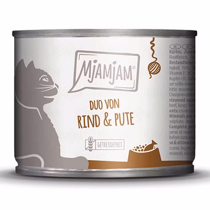MJAMJAM DUO leckeres Rind gute Pute an gedämpftem Kürbis ist ein getreidefreies Premium-Futter für Katzen. Hochwertiges Fleisch kombiniert mit Vitaminen und Nährstoffen für Katzen sorgt für eine leckere Mahlzeit, die alles beinhaltet, was Katzen benötigen. Durch den hohen Fleischanteil ist die Akzeptanz bei Katzen besonders hoch. Die Zutaten sind naturbelassen und selbstverständlich wird auf den Zusatz von Zucker oder synthetischen Konservierungsmittel verzichtet. Dies sorgt für ein artgerechtes Katzenfutter. Es handelt sich um ein Alleinfuttermittel.