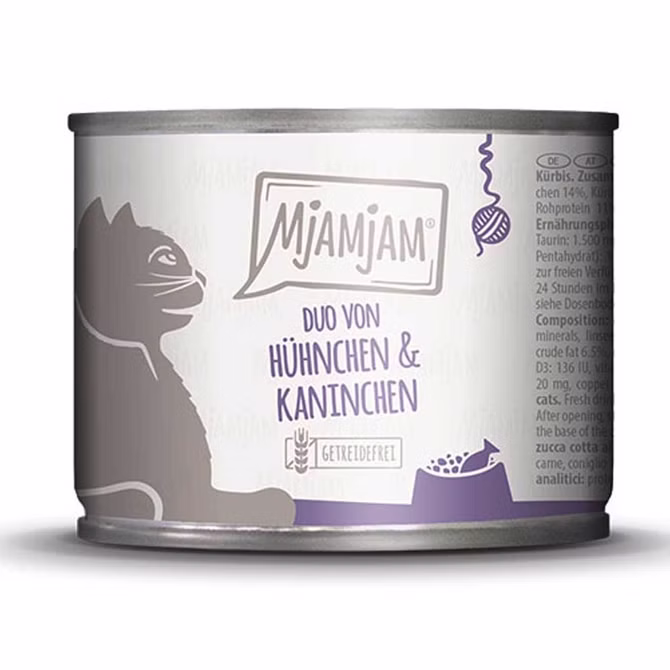 Mjamjam DUO saftiges Hühnchen Kaninchen ist ein getreidefreies Premium-Futter für Katzen. Hochwertiges Fleisch kombiniert mit Vitaminen und Nährstoffen für Katzen sorgt für eine leckere Mahlzeit, die alles beinhaltet, was Katzen benötigen. Durch den hohen Fleischanteil ist die Akzeptanz bei Katzen besonders hoch. Die Zutaten sind naturbelassen und selbstverständlich wird auf den Zusatz von Zucker oder synthetischen Konservierungsmittel verzichtet. Dies sorgt für ein artgerechtes Katzenfutter.