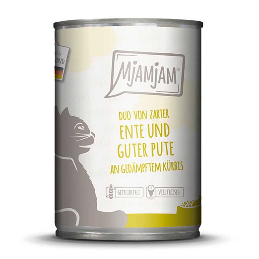 - Mjamjam DUO von zarter Ente Pute an gedämpftem Kürbis - mit allen für Katzen notwendigen Vitaminen und Nährstoffen
