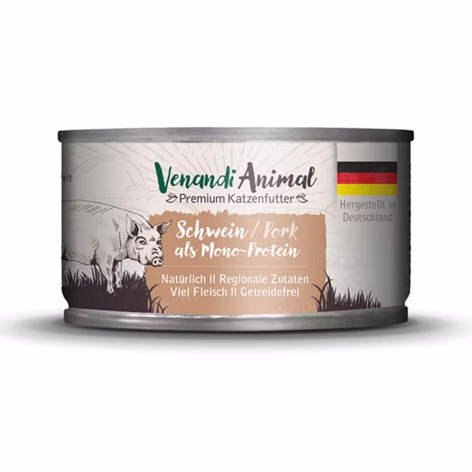 Venandi Animal Schwein pur ist eine monoprotein Katzenfutter, das ausschließlich Schweinefleisch und tierische Nebenprodukte vom Fleisch als natürliche Proteinquelle verwendet. Es kann somit als Futter für eine Ausschlußdiät verwendet werden. Das Futter enthält alles, was Katzen für eine gesunde Ernährung benötigen. Schweinefleisch darf unbedenklich von Katzen gefressen werden und darüber hinaus ist Schweinefleisch ein hochwertiger Proteinlieferant, der viel Eisen beinhaltet. Selbstverständlich ist auch dieses Futter getreidefrei und naturbelassen. Es enthält keine Zuckerzusätze und ist laktosefrei.