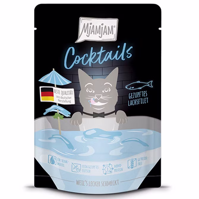 MjAMjAM Cocktails Gezupftes Lachsfilet bringt intensive Aromen und sorgt für ein unverwechselbares Geschmackserlebnis. Deine Katze wird diesen Drink aus kräftiger Brühe und fein gezupftem Fleisch lieben -und ganz nebenbei ihren Flüssigkeitshaushalt verbessern.
