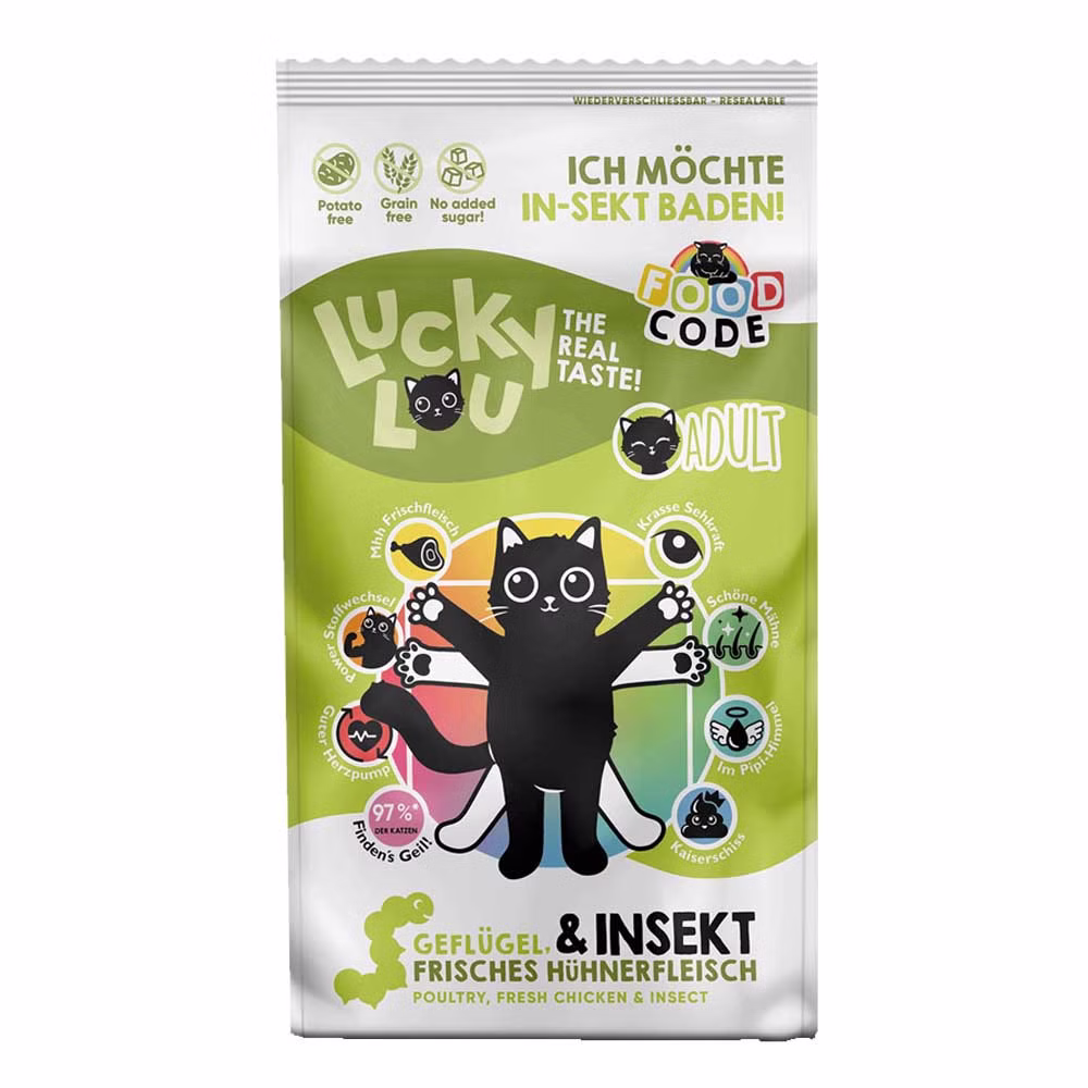 Lucky Lou Adult Geflügel Insekten ist ein besonderes Trockenfutter. Reichlich Geflügel- und dazu Insektenprotein versorgen Deine Katze in dieser besonderen Rezeptur, die selbstverständlich getreidefrei ist. Dieses Trockenfutter ist bestens geeignet für eine Mischfütterung mit dem Lucky Lou Nassfutter. Selbstverständlich ohne Zuckerzusatz und tierversuchsfrei hergestellt. Es enthält alles, was Katzen für eine artgerechte Ernährung benötigen.