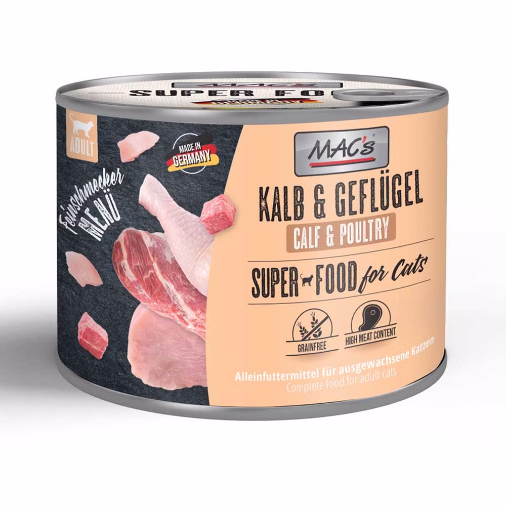 MACs Feinschmeckermenü Kalb Geflügel ist eine hochwertige, getreidefreie Vollnahrung für Katzen und enthält alle Nährstoffe, Vitamine und Mineralien, die Ihre Katze für ein gesundes Leben braucht. Es werden nur Rohstoffe aus deutschen Schlachthöfen verwendet, die auch für den menschlichen Verzehr zugelassen sind. Es handelt sich um ein Alleinfuttermittel für Katzen.