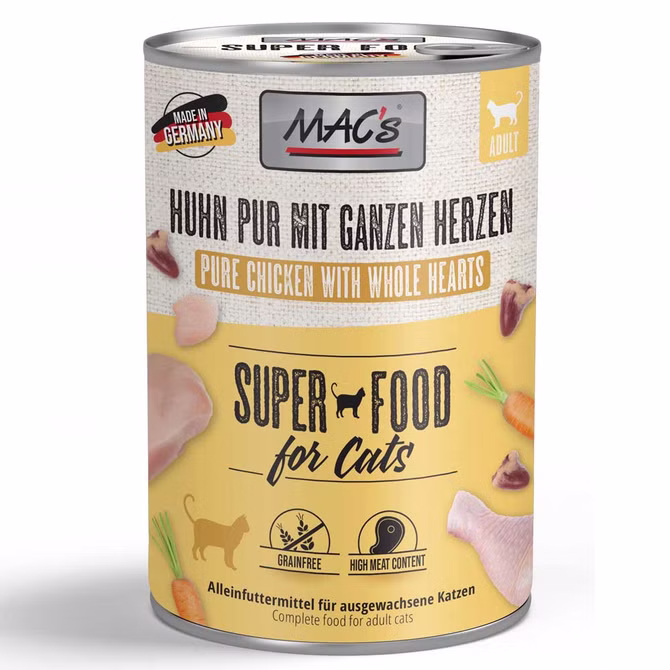 Macs Huhn pur mit ganzen Herzen ist ein Premium-Nassfutter für Katzen. Die getreidefreie Rezeptur hat eine hohe Akzeptanz und durch den hohen Fleischanteil ist es ein Gaumenschmaus für jede Katze. Durch die Versorgung von allen wichtigen Nährstoffen und Vitaminen werden Katzen artgerecht und voll umfassend ernährt. Es ist ein Alleinfuttermittel für Katzen made in germany.