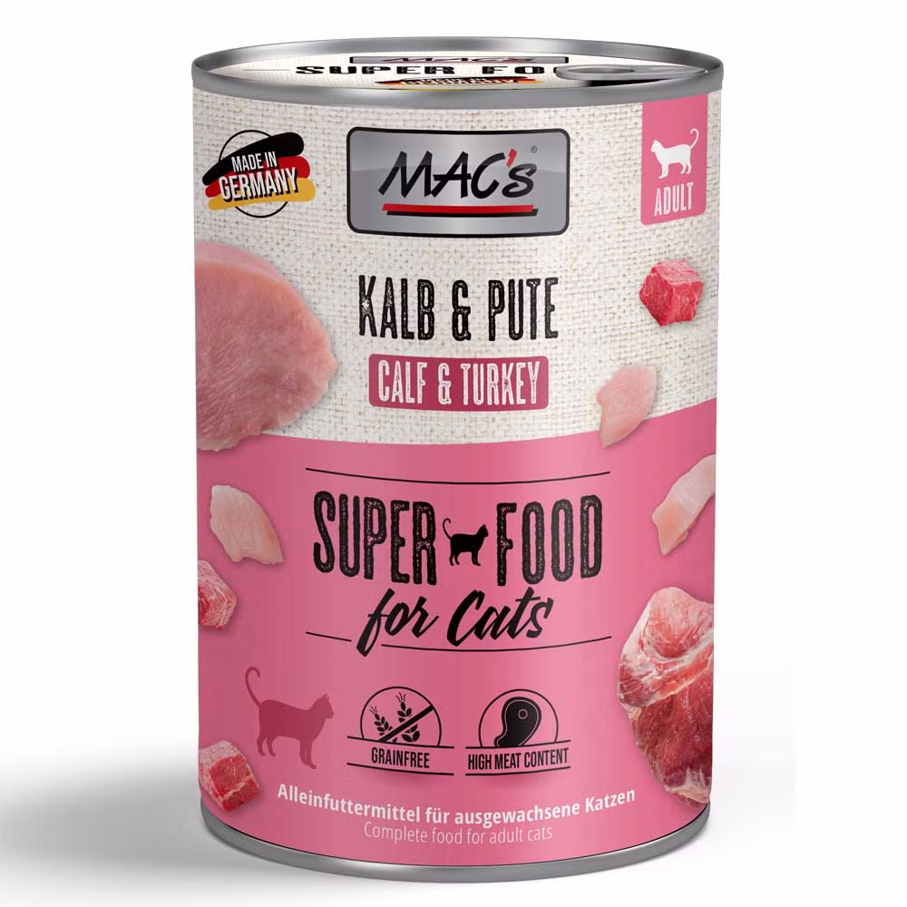 Macs Katzenfutter Kalb und Pute ist ein Katzenfutter mit einem Fleischanteil von mindestens 70%.