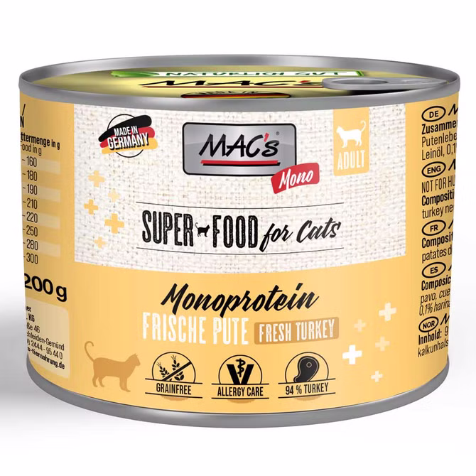 Macs Cat Mono Pute besteht ausschließlich aus Putenfleisch in Kombination mit Karotte und ist daher besonders gut für empfindliche oder allergieempfindliche Katzen geeignet. Besonders Katzen, für die eine Ausschlußdiät angezeigt ist, profitieren von diesem Futter. Die besondere Rezeptur ist getreidefrei und ein besonderes Geschmackserlebnis für Ihren Liebling. Durch schonende Zubereitung und die Zugabe von Vitaminen und Mineralstoffen wird eine naturnahe Ernährung Ihrer Katze erreicht.