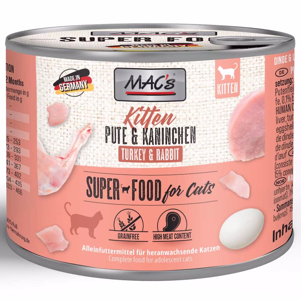 Macs Kitten Pute Kaninchen ist ein getreidefreier Gaumenschmauss für kleine Kätzchen.