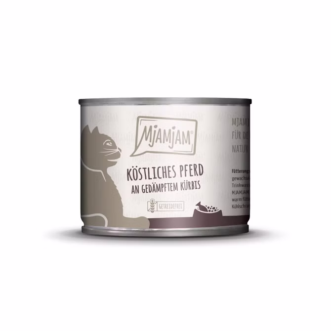 MjAMjAM köstliches Pferd an gedämpftem Kürbis bietet Katzen neben einem extra hohen Fleischanteil alles was sie brauchen. Das frische Pferdefleisch, verfeinert mit gesundem Kürbis, ergibt eine vollwertige Mahlzeit bei gleichzeitig sehr hoher Verträglichkeit und enthält alle wichtigen Vitamine und Mineralie. Auf Getreide, Zucker, Konservierungs- oder Geschmacksstoffe sowie synthetische Bindemittel wird verzichtet.