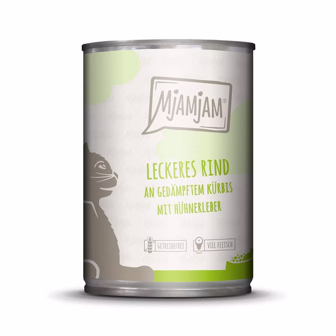 MjAMjAM leckeres Rind an gedämpftem Kürbis bietet Katzen neben einem extra hohen Fleischanteil alles was sie brauchen. Das Rindfleisch und der gesunde Kürbis sowie die Hühnerleber ergeben eine vollwertige Mahlzeit bei gleichzeitig sehr hoher Verträglichkeit und enthält alle wichtigen Vitamine und Mineralie. Auf Getreide, Zucker, Konservierungs- oder Geschmacksstoffe sowie synthetische Bindemittel wird verzichtet.