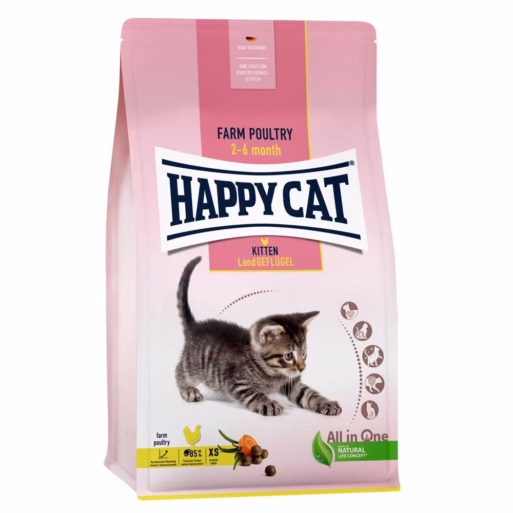 Verwöhne dein Kitten von Anfang an mit dem schmackhaften Trockenfutter von Happy Cat. Leicht verdauliches Land-Geflügel mit zarter Karotte und feinem Rosmarin verwöhnen Dein Kätzchen. Die Rezeptur enthält alles was dein Liebling benötigt. Die extra kleinen Kroketten und außerwählten Zutaten sind besonders für Katzenwelpen ab der 5. Lebenswoche bis zum 6. Monat geeignet.