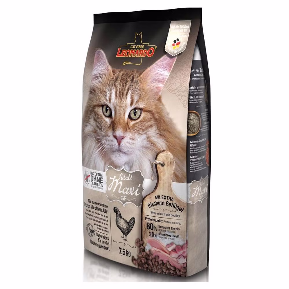 Leonardo adult Maxi GF ist ein getreidefreies hochwertiges Trockenfutter für erwachsende Katzen mit extra großen Kroketten. Große Katzenrassen wie zum Beispiel Norwegische Waldkatzen oder Maine Coon haben besondere Anforderungen an ihr Futter. Die großen Maxi-Kroketten beschäftigen die Katzen bei der Nahrungsaufnahme länger. Dadurch wird der Speichelfluss angeregt.