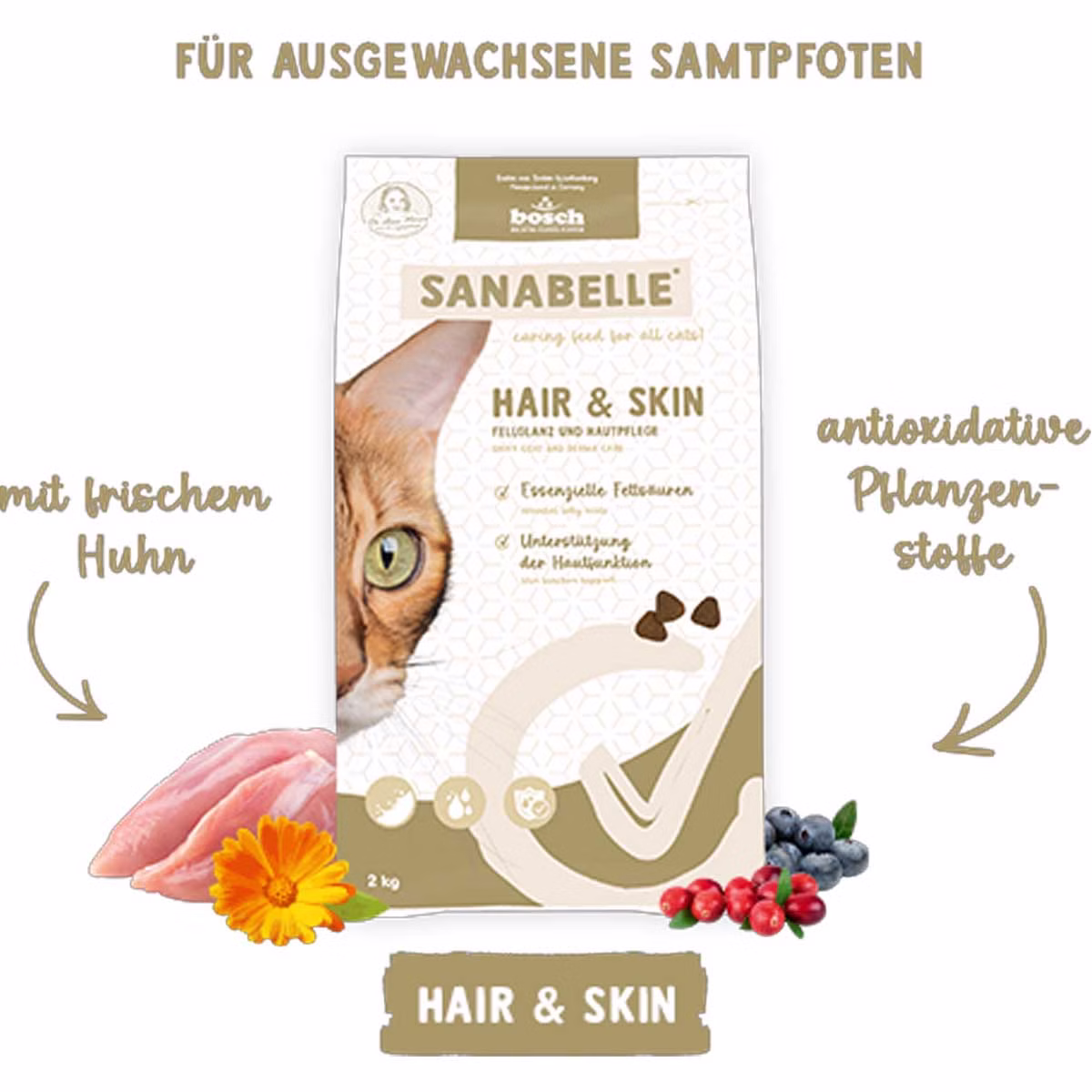 Sanabelle Hair and Skin wurde speziell für ausgewachsene Katzen entwickelt, deren Haut und Fell besondere Pflege von innen benötigen – sei es durch genetische Veranlagung, Stress, Futterunverträglichkeiten oder das Alter. Besonders langhaarige Katzen profitieren von der nährstoffreichen Rezeptur mit funktionalem Zusatznutzen für Fellstruktur, Hautbarriere und Zellschutz.