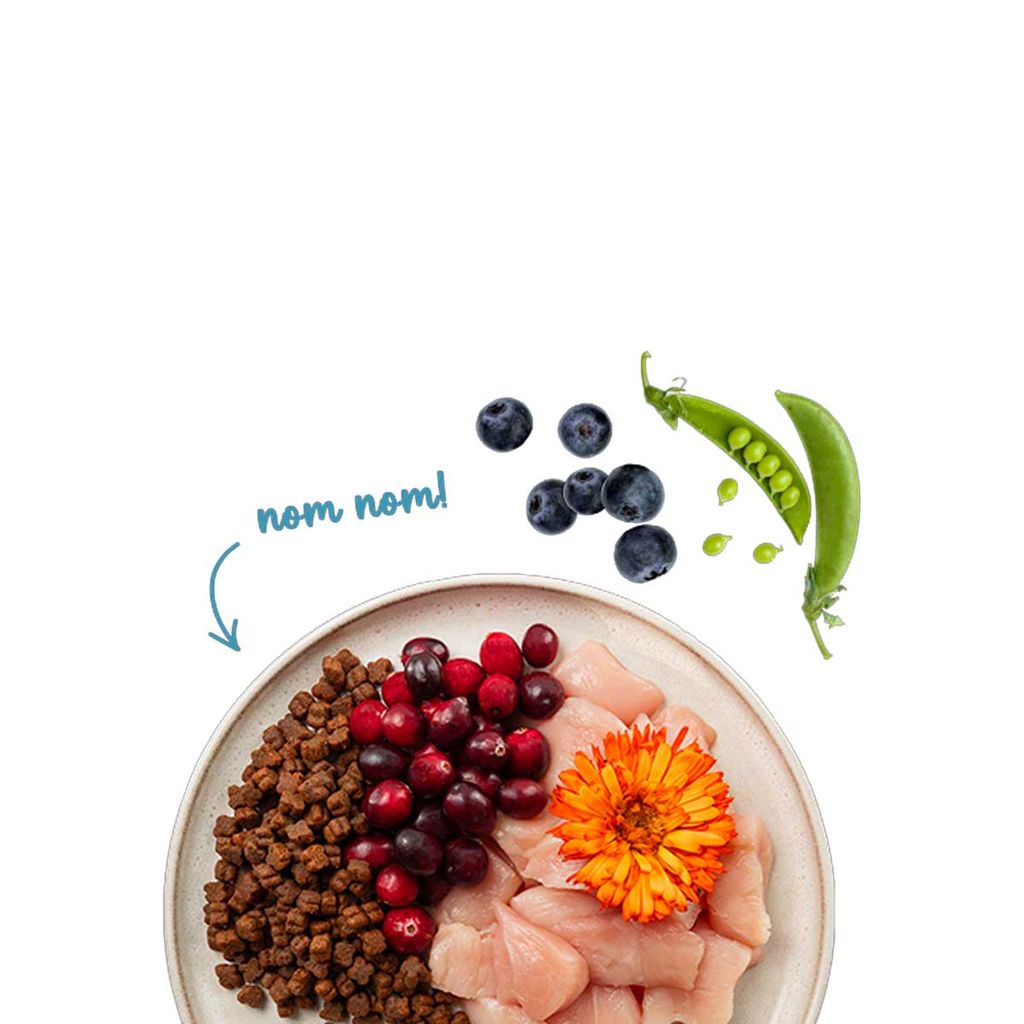 Frisches Hühnchenfleisch (25 %), Mais, Geflügelprotein (getrocknet), Tierfett, Grieben (getrocknet), Gerste, Maisprotein, Proteinhydrolysat, Lachsöl (1 %), Reis (1 %), Erbsen (getrocknet, 0,8 %), Lebermehl, Calciumcarbonat, Kaliumchlorid, Hefe (getrocknet, 0,2 %), Preiselbeeren (getrocknet, 0,1 %), Blaubeeren (getrocknet, 0,1 %), Petersilie (getrocknet, 0,1 %), Ringelblumenblüten (getrocknet, 0,05 %).