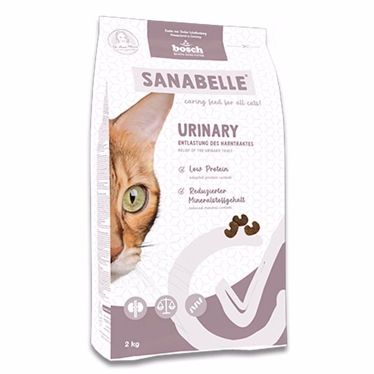 Sanabelle Urinary ist besonders geeignet für alle ausgewachsenen Katzen, die sensibel im Bereich der harnabführenden Organe reagieren. Durch seinen verringerten Gehalt an Proteinen und Mineralstoffen (low protein) und die damit einhergehende Verringerung von harnpflichtigen Abbauprodukten entlastet Sanabelle Urinary auf ernährungsphysiologischem Weg die Nieren und harnabführenden Organe (urinary tract care).
