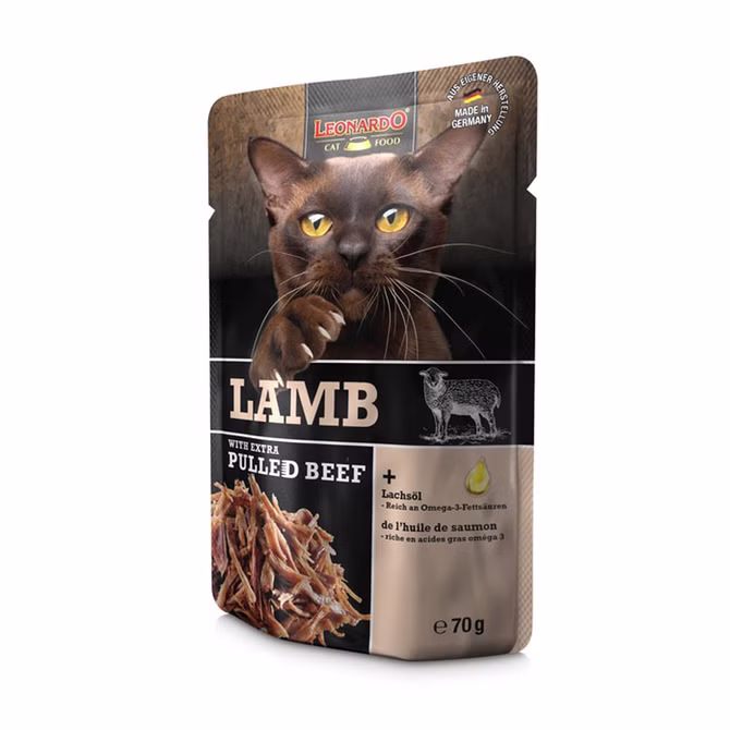 Leonardo Lamb mit pulled Beef ist ein außergewöhnliches Katzenfutter bester Qualität. Leonardo Lamb mit pulled Beef Katzenfutter ergänzt den schon hohen Anteil an verarbeitetem Lammfleisch mit einer Extraportion pulled beef, also gezupften Rindfleisch, wie man es schon aus dem Restaurant kennt. Diese einmalige Kauerlebnis erfreut unsere Katzen und macht es zu einem wahren Katzenschmaus.