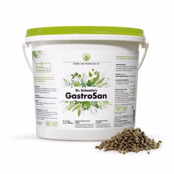 Dr Schaette Gastrosan ist ein Ergänzungsfuttermittel für Pferde mit zahlreichen Kräutern, das Schafgarbenkraut und Bockshornkleesamen enthält. Es ist getreide- und melassefrei.