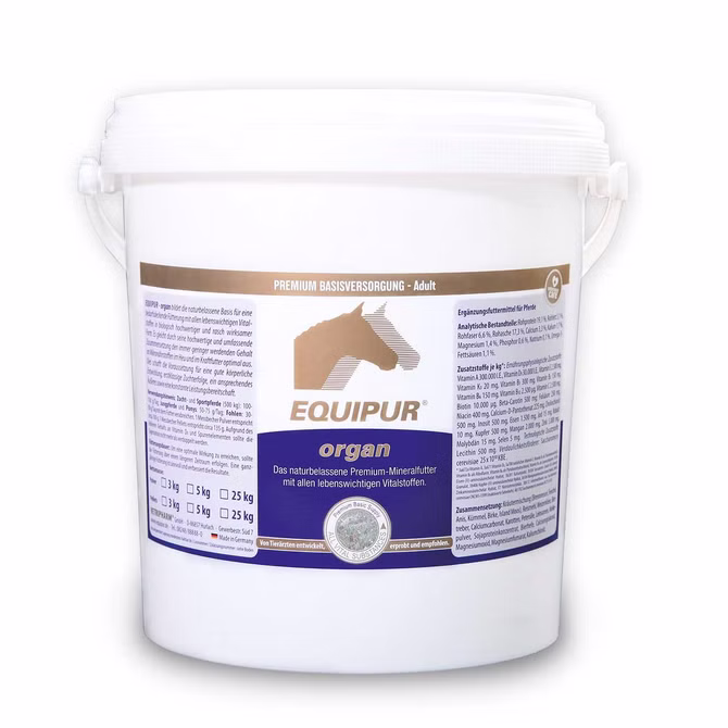 Equipur organ ist ein Premium Mineralfutter, das unsere Pferde mit allen wertvollen Vitalstoffen versorgt. Es bildet die naturbelassene Basis für eine bedarfsdeckende Fütterung mit allen lebenswichtigen Vitalstoffen in biologisch hochwertiger und rasch wirksamer Form. Es gleicht durch seine umfassende Zusammensetzung den immer geringer werdenden Gehalt an Mikronährstoffen im Heu und im Kraftfutter optimal aus.