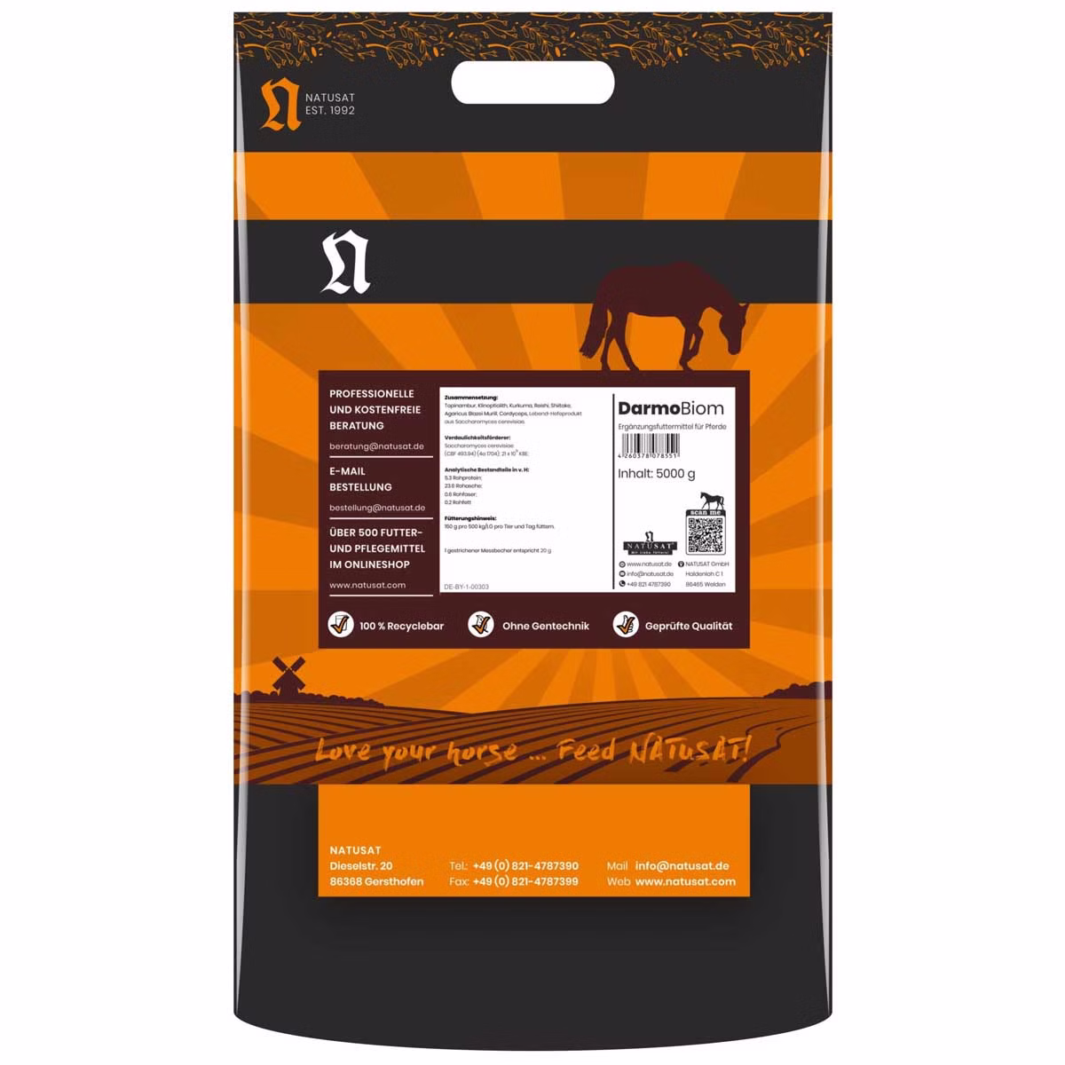 Natusat DarmoBiom ist auf das Mikrobiom im Pferdedarm ausgerichtet. Zahlreiche Probleme rund um die Verdauung von Pferden können auf eine verschobene Darmflora hinweisen. Hier ist der Ansatzpunkt dieses Ergänzungsfutters, denn es unterstützt die Darmflora des Pferdes. Eine normale, artgemäße Darmflora ermöglicht dem Pferd die reibungslose Verdauung aller Nahrungsbestandteile.