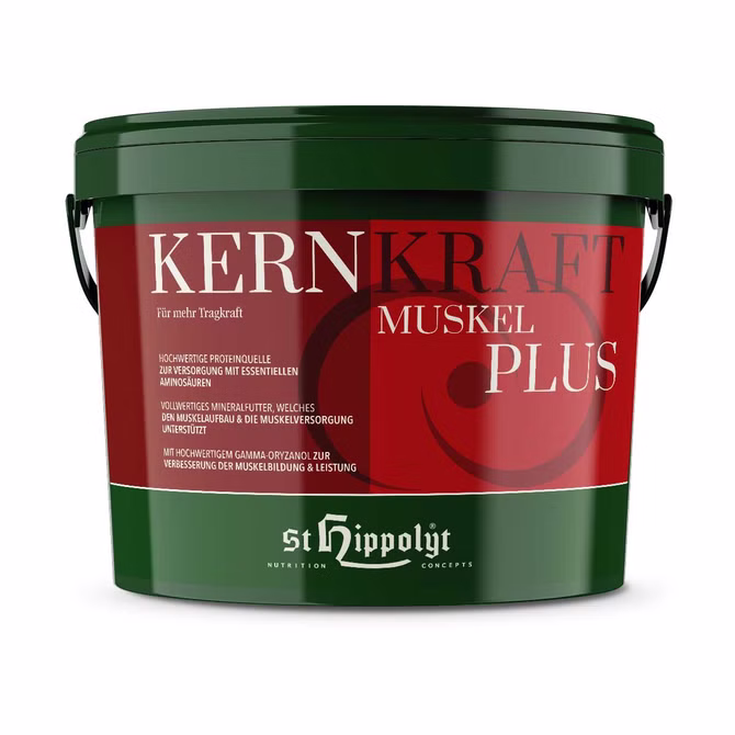 St.Hippolyt Kernkraft Muskel Plus ist ein Mineralfuttermittel, das Pferde mit essentiellen Aminosäuren versorgt. Es unterstützt den Muskelaufbau und die Muskelversorgung. Es enthält hochwertiges Gamma-Oryzanol zur Verbesserung der Muskelbildung und -Versorgung.