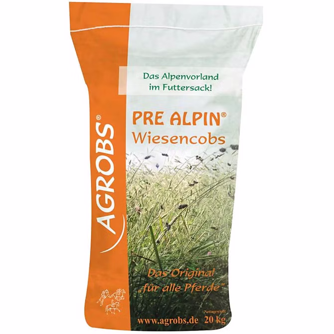 Agrobs Pre Alpin Wiesencobs sind ein ideales Grundfutter in extra großer Cobsform. Sie setzen sich aus einer einzigartigen Mischung von über 60 verschiedenen Gräsern und Kräutern des bayerischen Alpenvorlandes zusammen. Die ständig kontrollierten Wiesen werden zum richtigen Reifezeitpunkt geerntet. Dadurch wird ein niedriger Eiweißgehalt und ein hoher Rohfasergehalt für eine optimale Pferdefütterung gewährleistet.