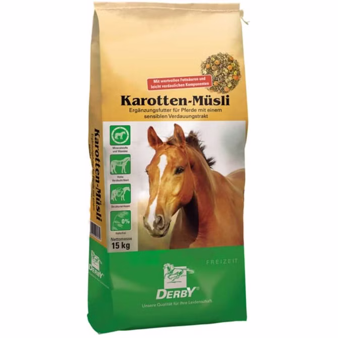 DERBY® Karotten Müsli ist ein Ergänzungsfuttermittel für Pferde. Die haferfreie Rezeptur ist hochverdaulich.